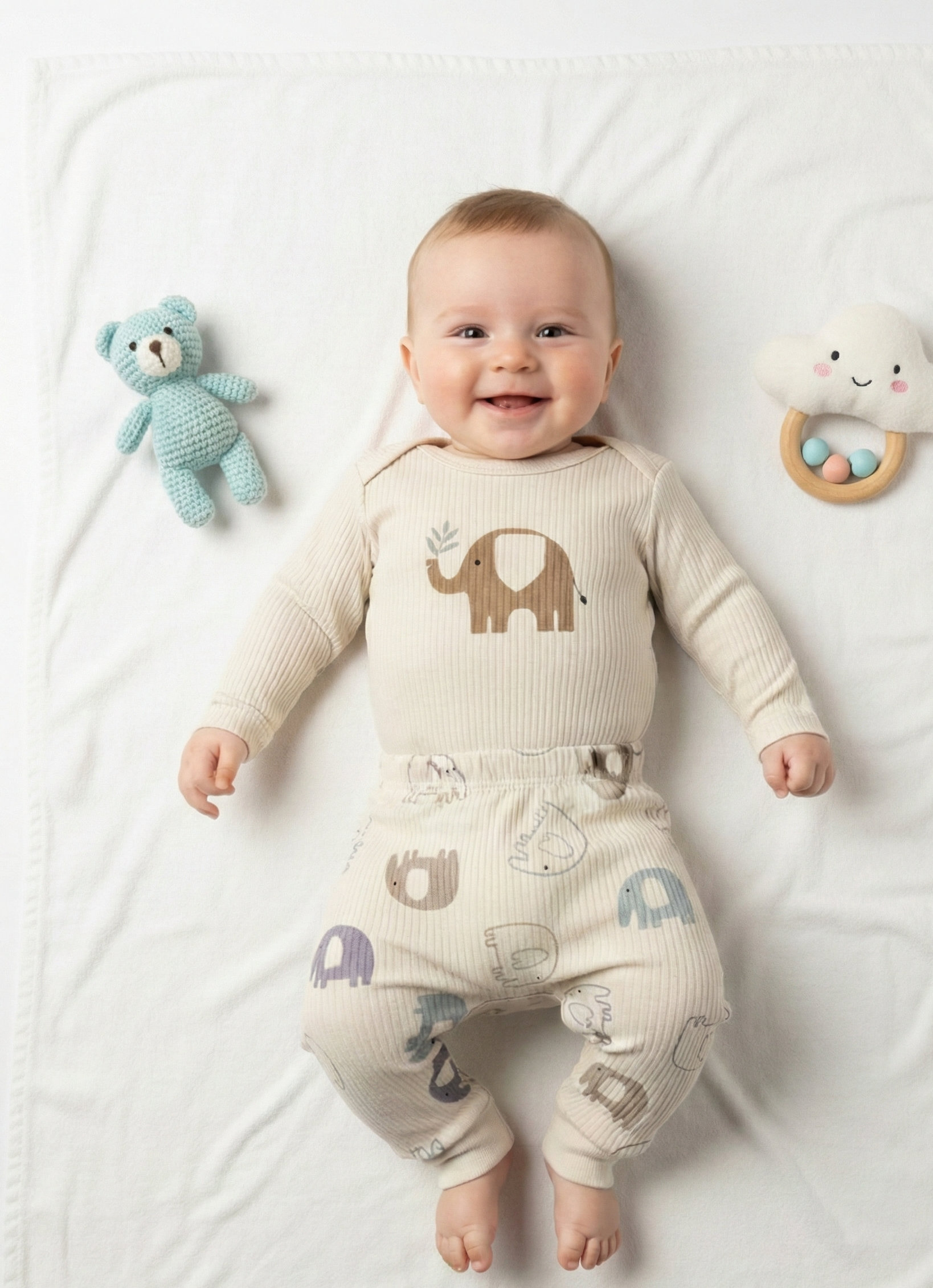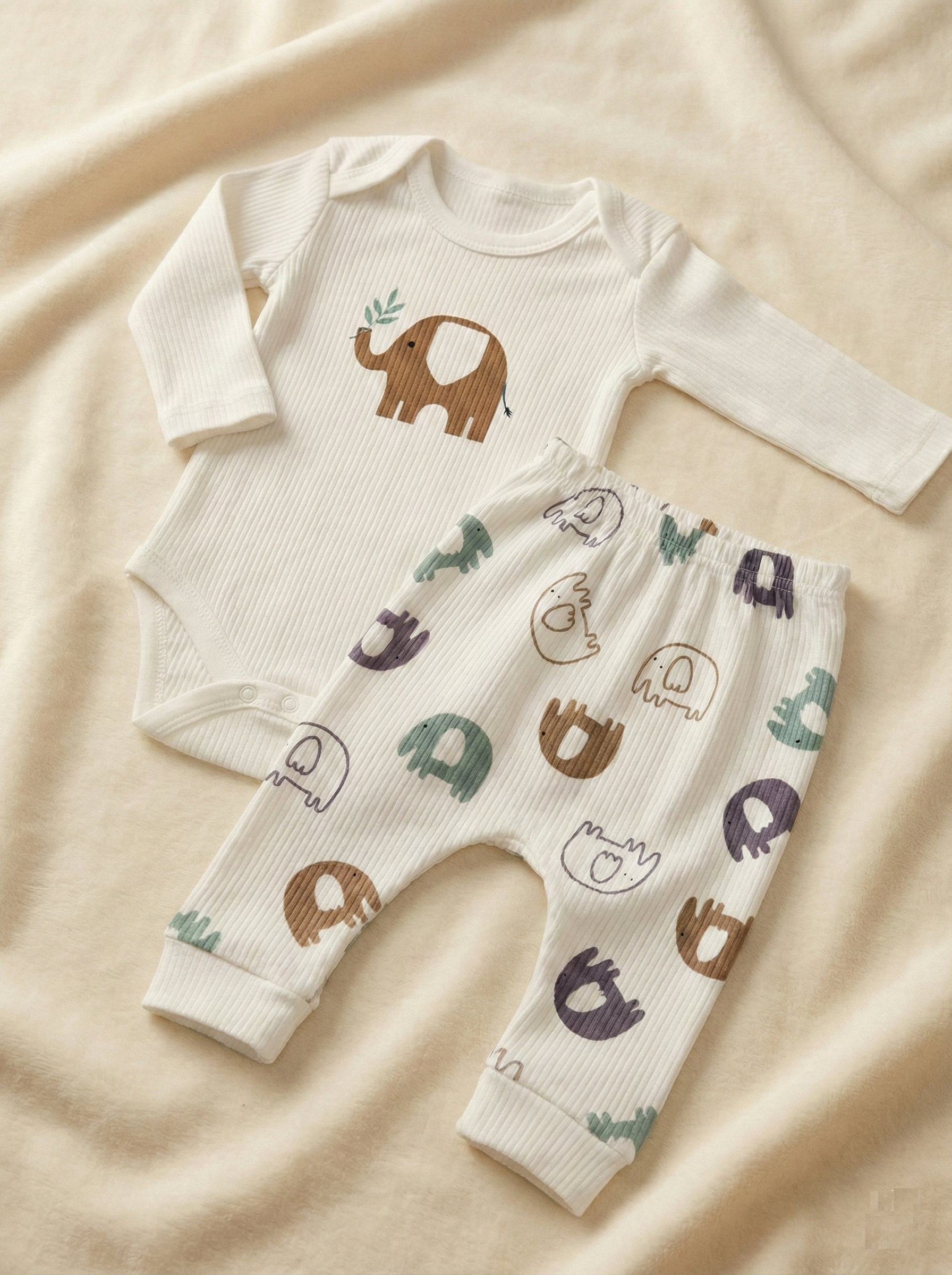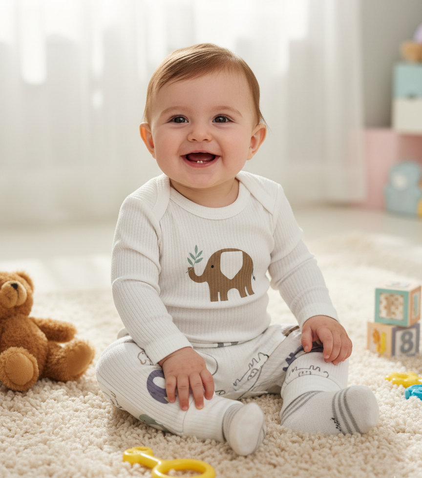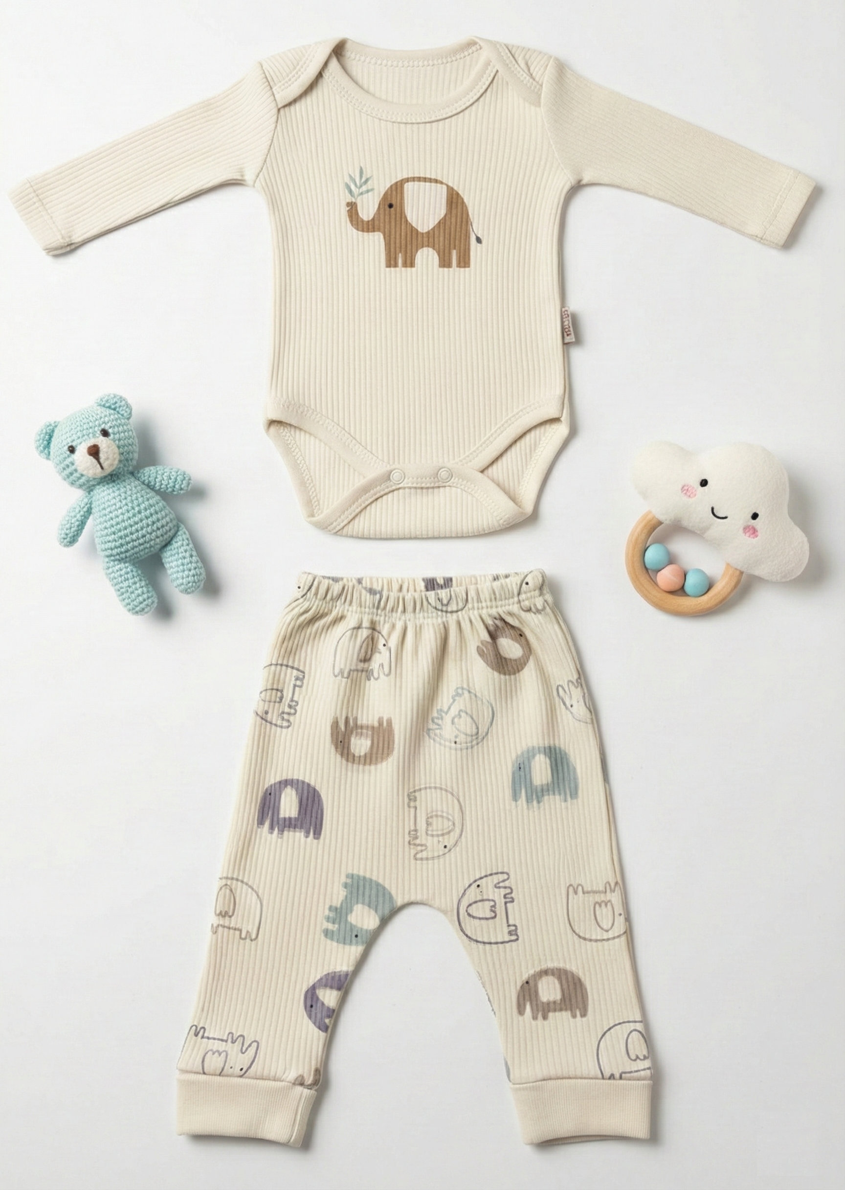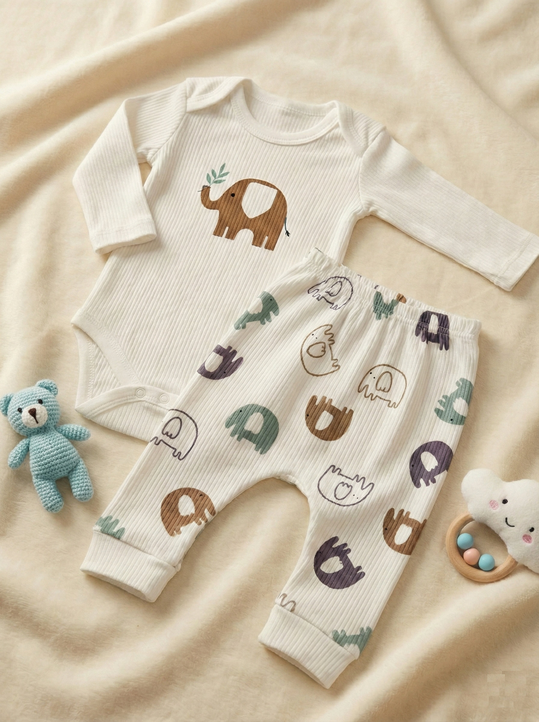 Minikler için tasarlanan sevimli fil temalı takım, bebeğinizin hem uykuda hem de oyunda konforlu hissetmesini sağlar. Yumuşacık fitilli dokusu ve esnek yapısı sayesinde bebeğinizin hareketlerini kısıtlamaz.