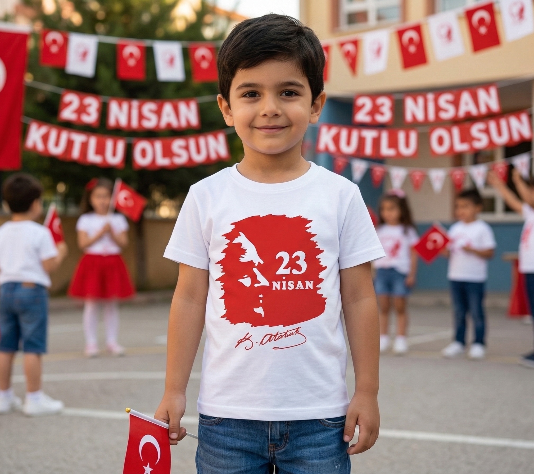 23 Nisan Özel Atatürk ve İmzası Baskılı Kısa Kollu Pamuklu Unisex Çocuk T-Shirt / Tişört