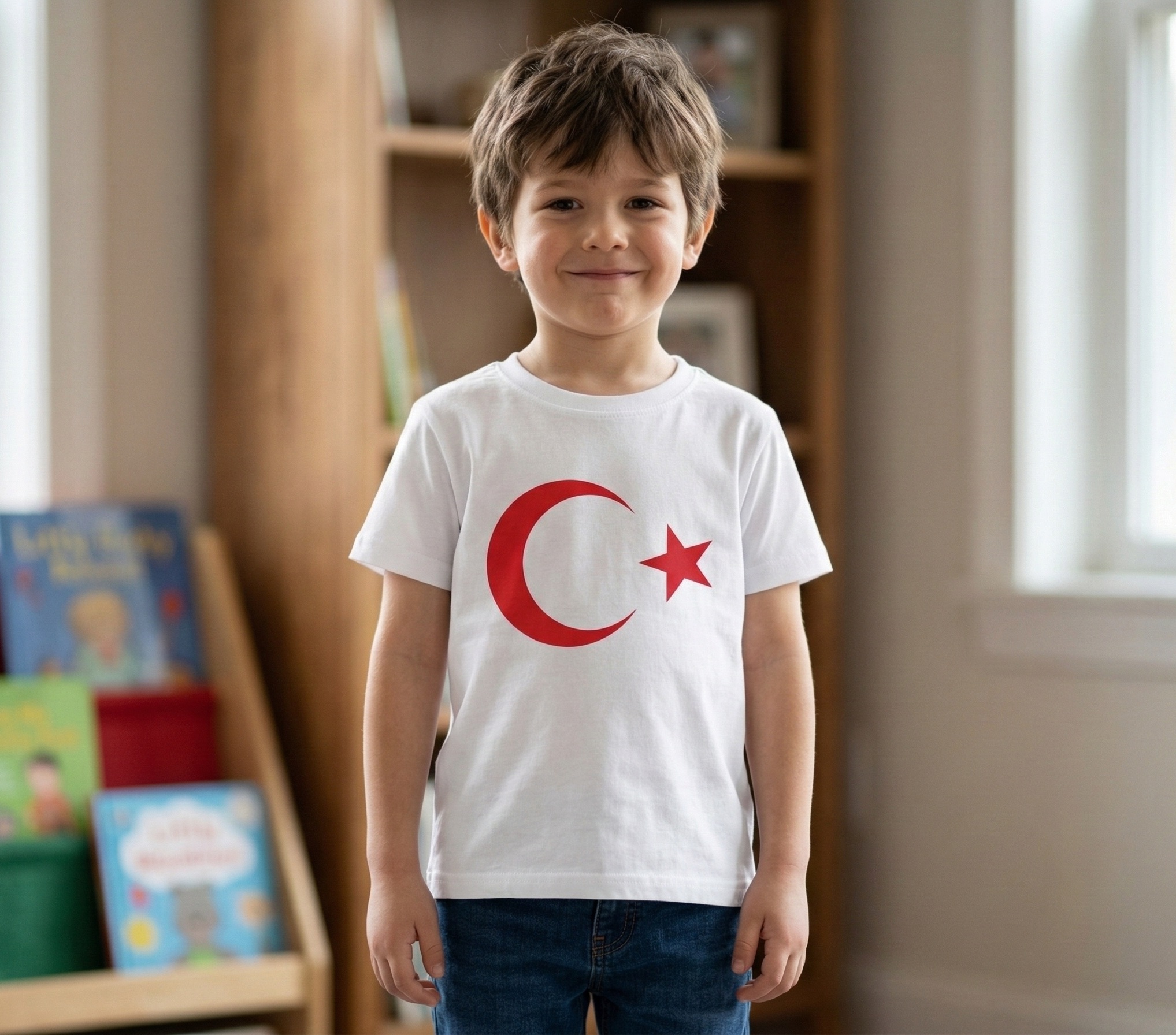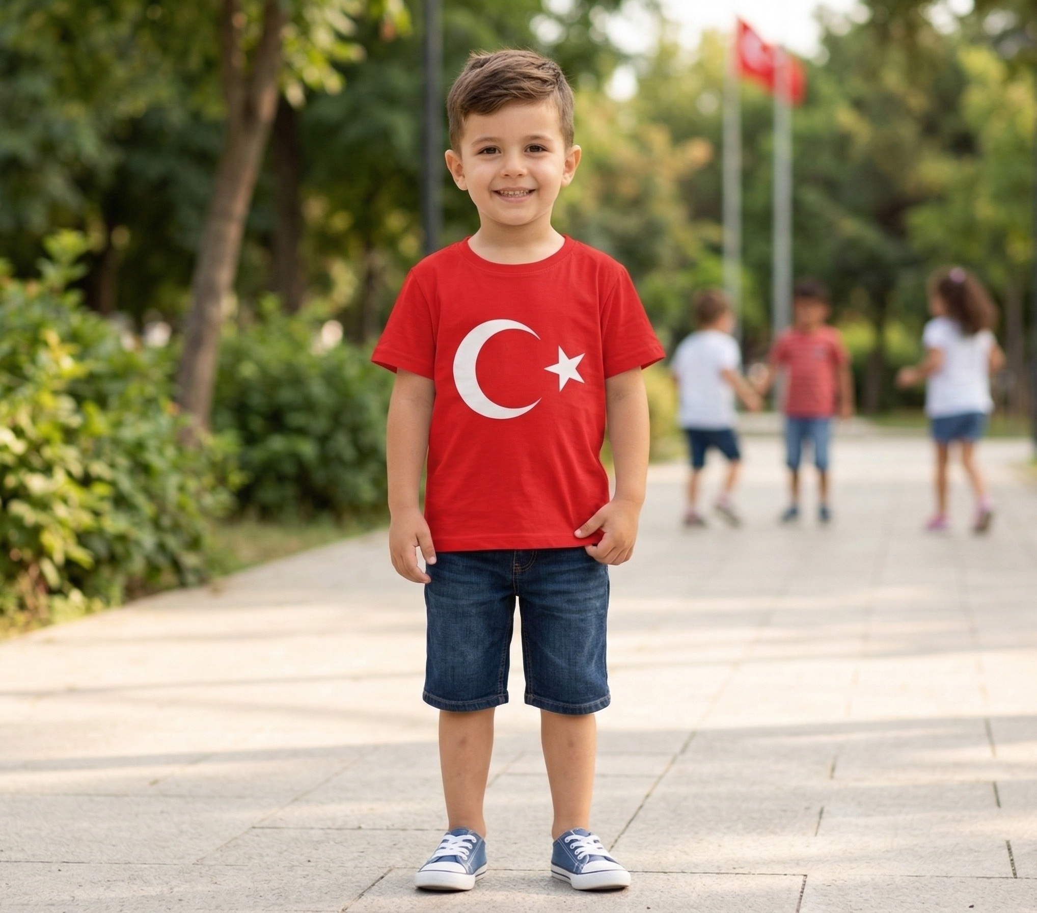 Ürün detayları Ürün tanımı: 23 Nisan özel Türk Bayrağı baskılı kısa kollu pamuklu unisex çocuk tişört/t-Shirt mevsimi: Yazlık.