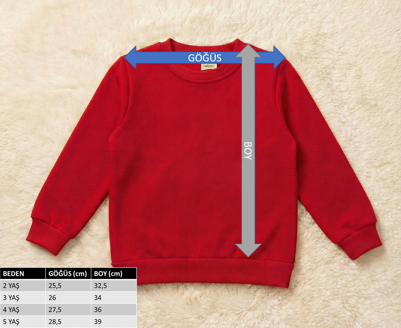 Beden bilgileri fotoğraflarda yer almaktadır. Ürün tam kalıptır, çocuğunuzun yaşıtlarından kalıplı olduğunu düşünüyorsanız, bir beden büyük almanızı tavsiye ederiz.