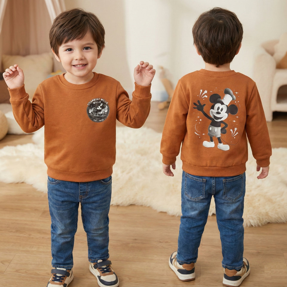 Erkek Çocuk Vintage 1928 Steamboat Willie “Mickey Mouse” Temalı % 100 Pamuklu İçi Polarlı Sweatshirt (Turuncu)
