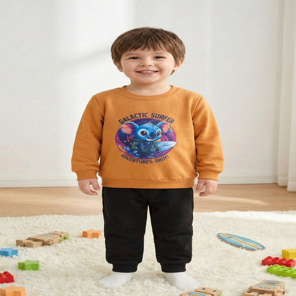 Galaktik Sörfçü Koala Baskılı Pamuklu İçi Polarlı Mevsimlik Sweatshirt (Turuncu)