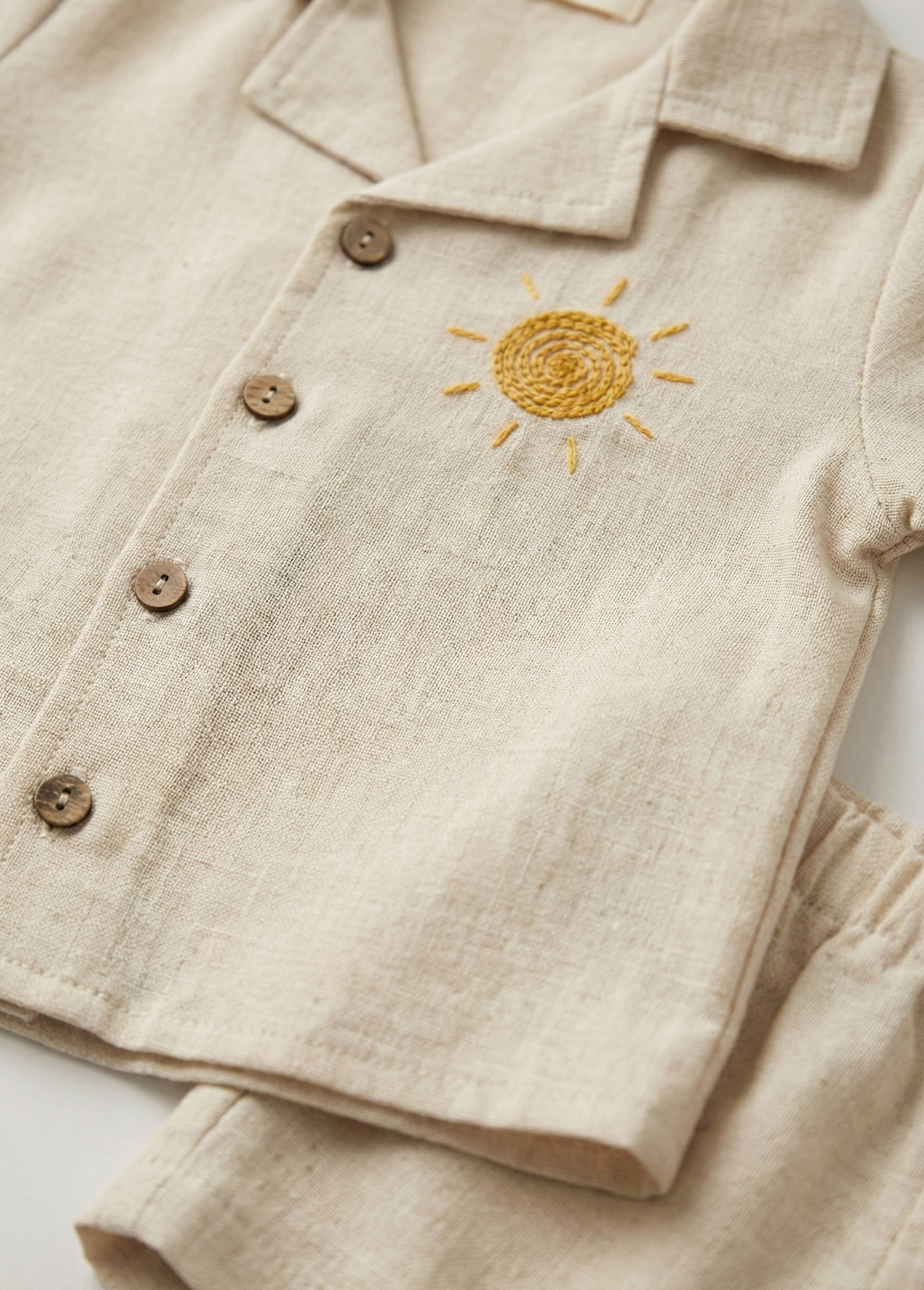 Doğal Keten Kumaş: Yüksek kaliteli keten karışımlı dokusu sayesinde bebeğinizin cildini tahriş etmez, terletme yapmaz ve gün boyu konfor sağlar.