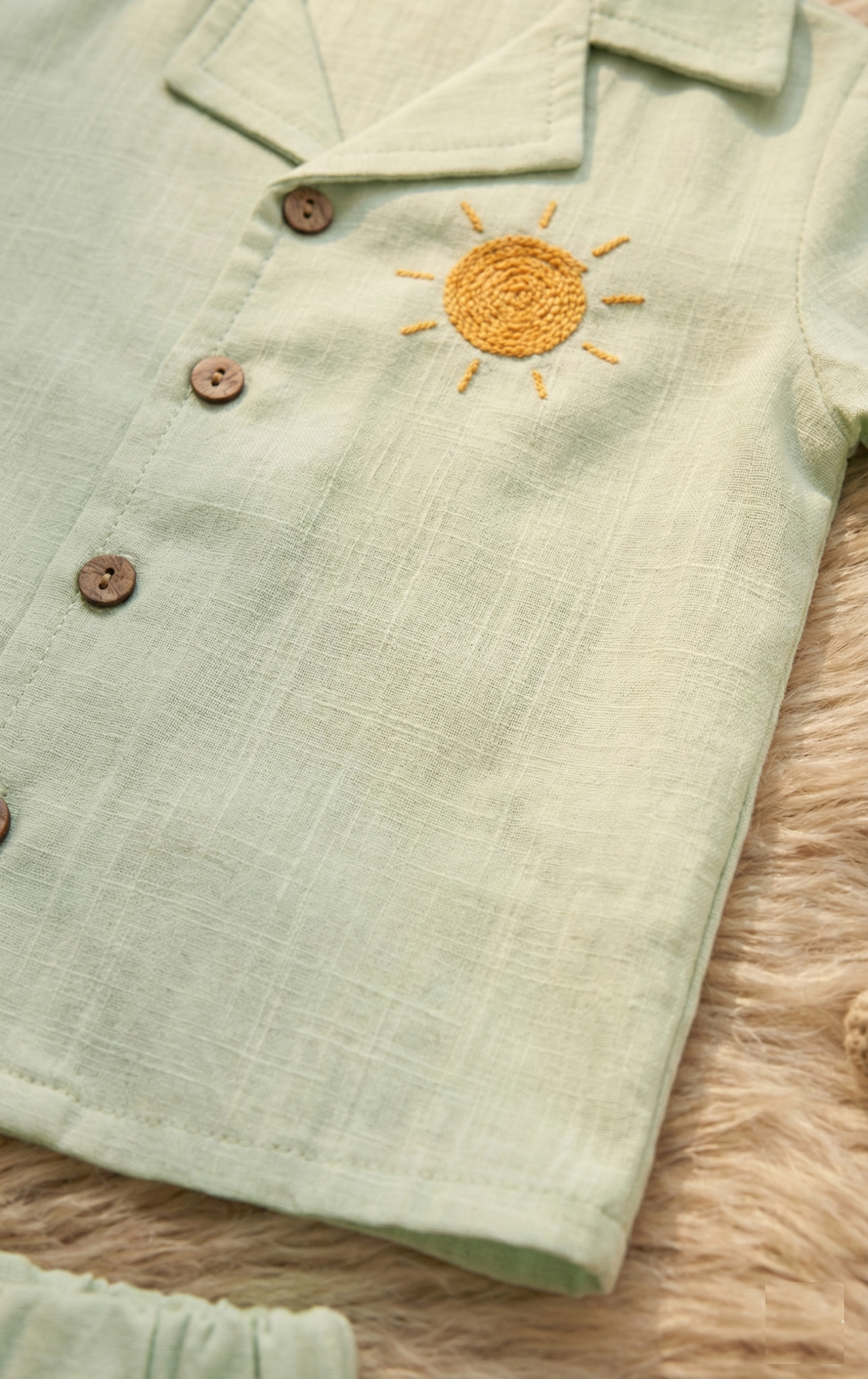 Özel Nakış Detayı: Göğüs kısmında bulunan minimalist güneş nakışı, el işçiliği hissi veren zarif bir dokunuş katar.