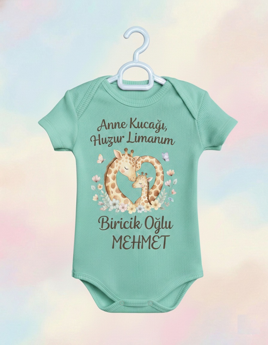 Bebeğinizin hassas cildi için sevgiyle tasarlanan bu özel tasarım body, hem şıklığı hem de fonksiyonelliği bir arada sunuyor. “Anne Kucağı, Huzur Limanım” mesajıyla duygusal bir dokunuş yaparken, yüksek kaliteli kumaş yapısıyla bebeğinizin konforunu garanti altına alıyor.