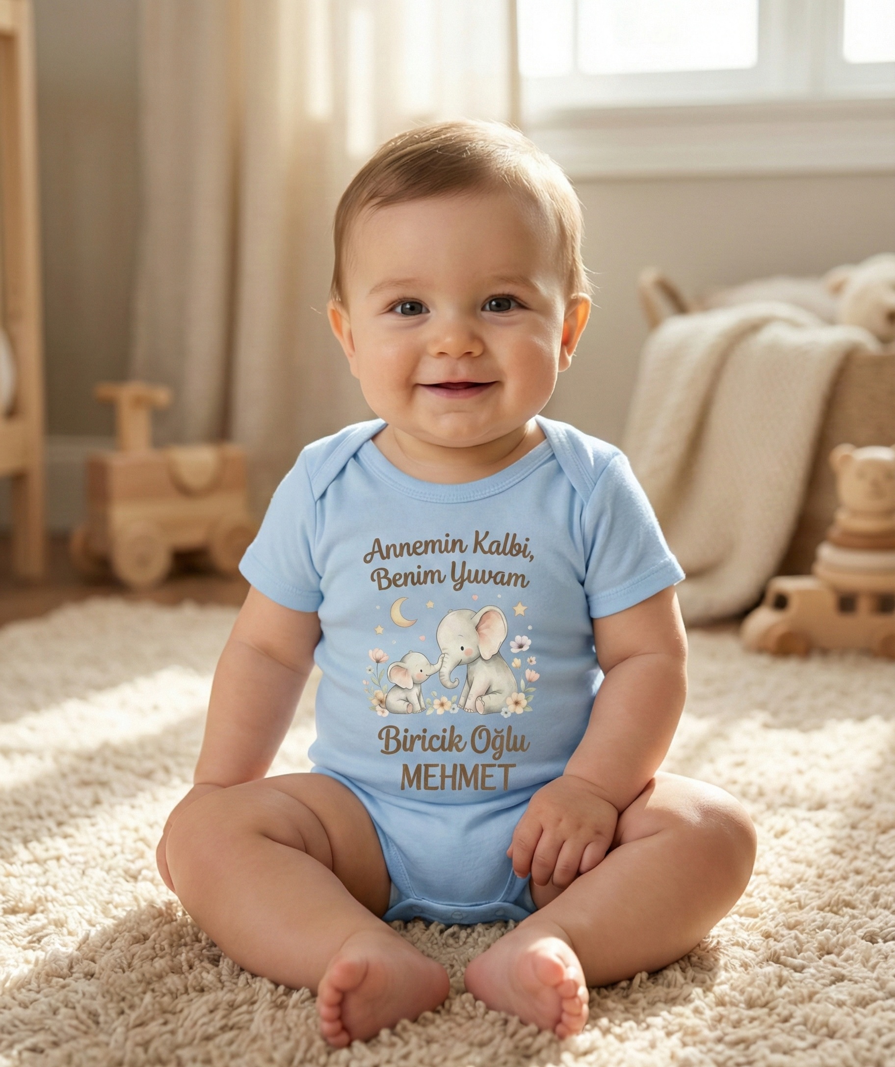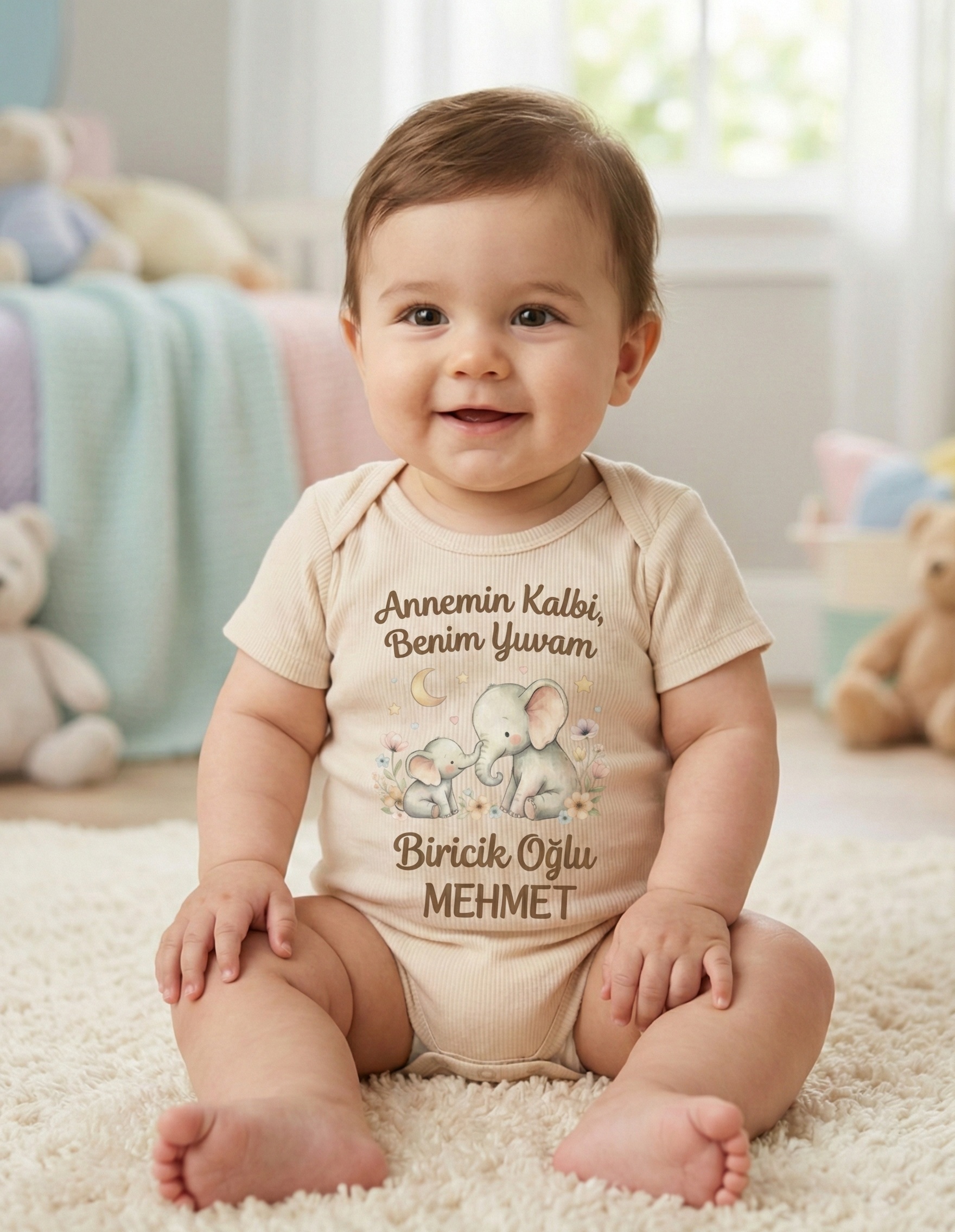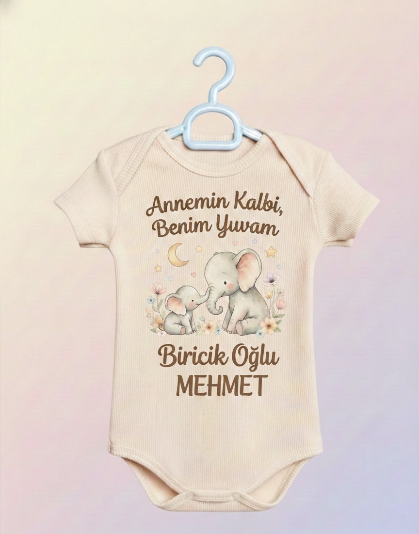 Bebeğinizin hassas cildi ve konforu düşünülerek özenle tasarlanan bu özel tasarım body, hem şıklığı hem de üstün kumaş kalitesiyle annelerin vazgeçilmezi olacak. “Annemin Kalbi, Benim Yuvam” yazısı ve sevimli fil figürleri ile bebeğinizin biricikliğini yansıtırken, isme özel hazırlanmasıyla harika bir hatıra niteliği taşır. Neden Bu Body’yi Tercih Etmelisiniz?