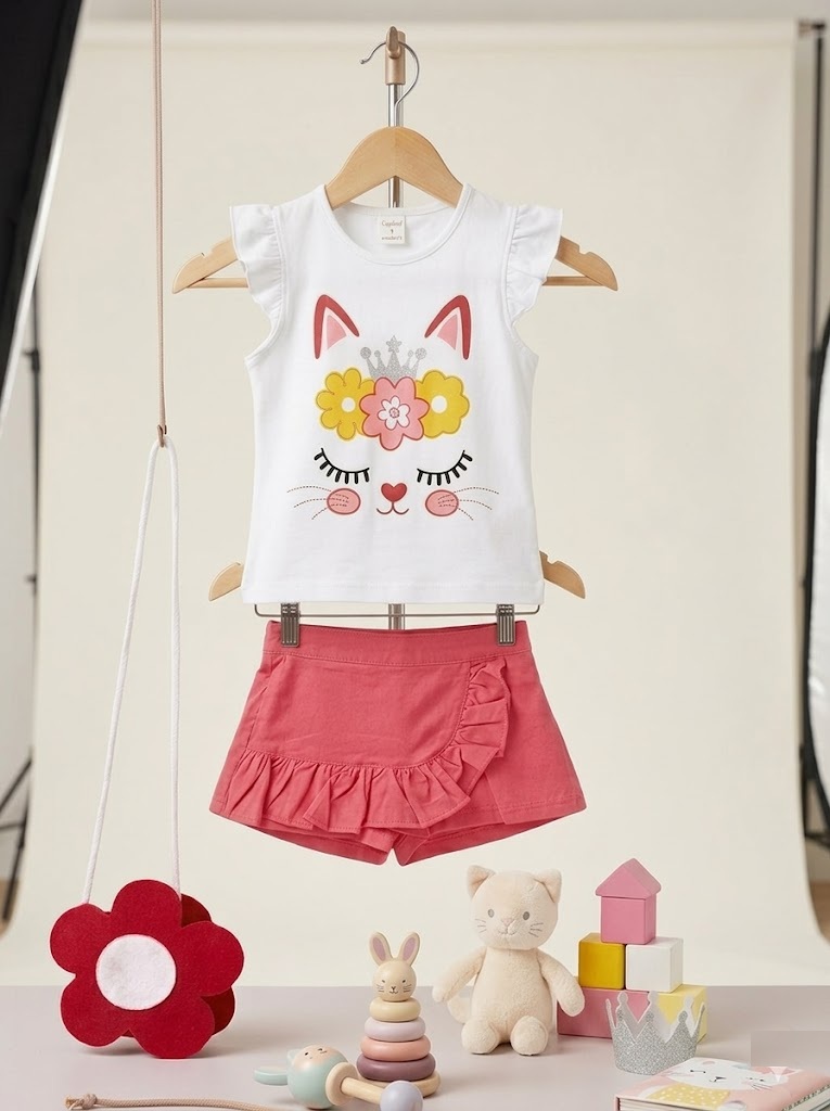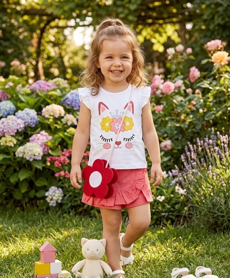 Kedi Desenli Şort Etekli Yazlık Çantalı Kolsuz Penyeli 3’lü Bebek Çocuk Takımı – Pembe