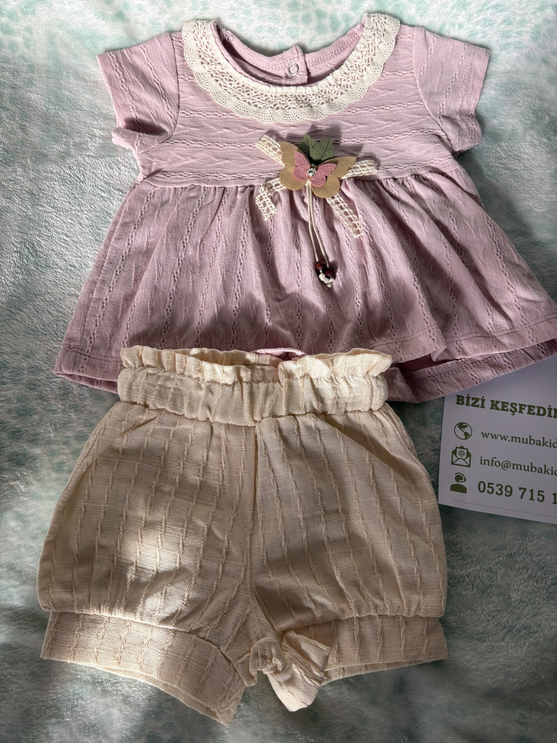 Vintage esintili dantel yakası ve üç boyutlu kelebek detayıyla öne çıkan özel tasarım ikili takım, bebeğinizin hem rahat etmesini hem de göz kamaştırmasını sağlar. Kendinden dokulu, yumuşacık ve %100 pamuk jakar kumaşı hassas ciltlere nazikçe uyum sağlarken; esnek belli büzgülü şortu gün boyu maksimum hareket özgürlüğü sunar.