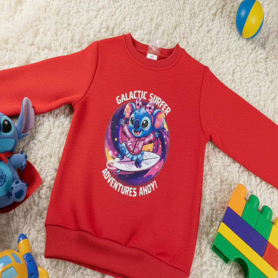 Kız Çocuk Galaktik Sörfçü Koala Baskılı Pamuklu İçi Polarlı Mevsimlik Sweatshirt (Kırmızı)