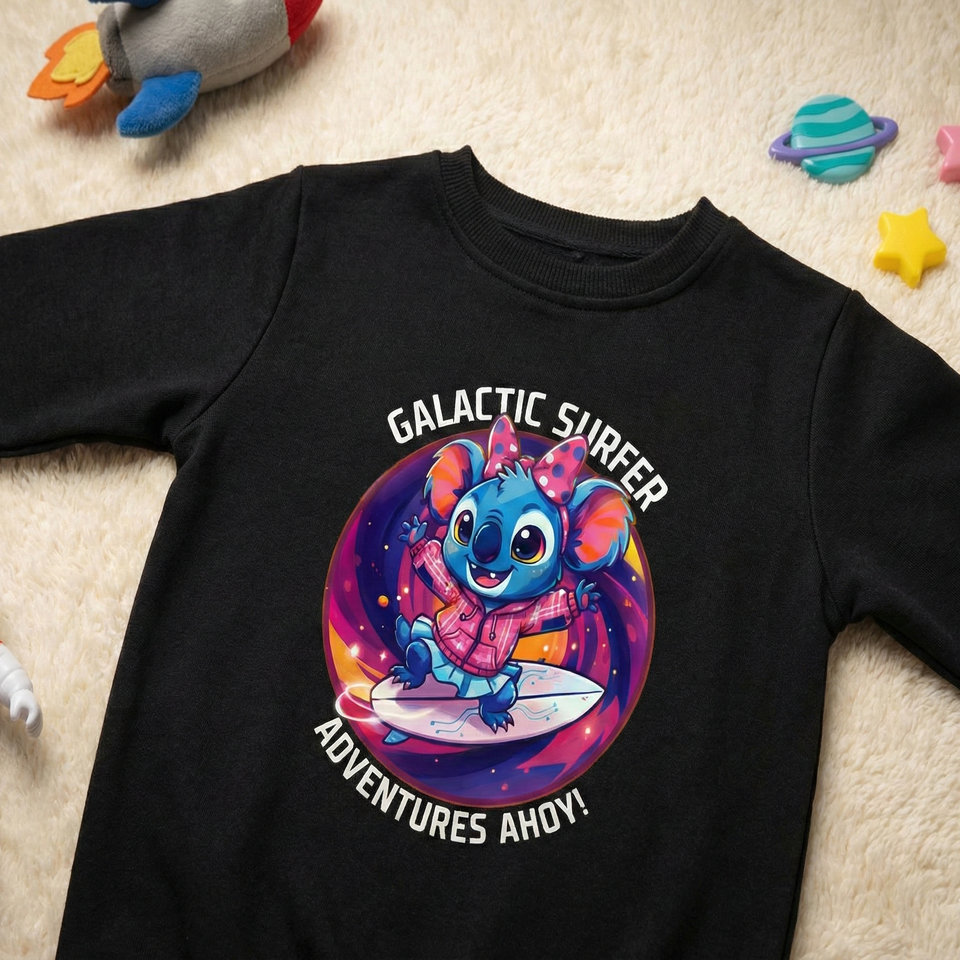Kız Çocuk Galaktik Sörfçü Koala Baskılı Pamuklu İçi Polarlı Mevsimlik Sweatshirt (Siyah)
