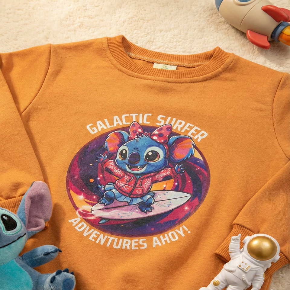 Kız Çocuk Galaktik Sörfçü Koala Baskılı Pamuklu İçi Polarlı Mevsimlik Sweatshirt (Turuncu)