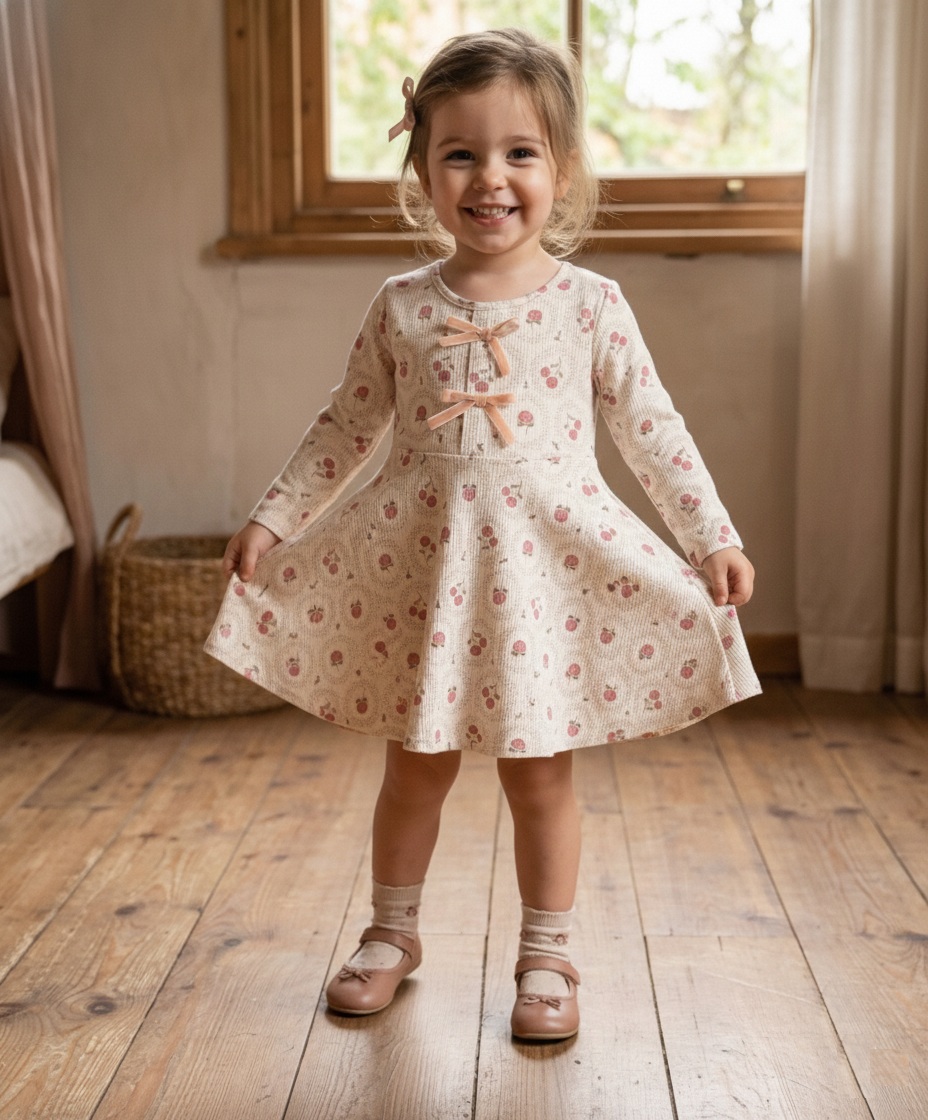 Minik prenseslerin gardırobuna hem neşeli hem de şık bir dokunuş! Krem renginin zarafetini canlı kiraz desenleriyle buluşturan bu özel tasarım elbisemiz, miniklerin hem özel günlerde hem de günlük oyun saatlerinde favorisi olacak.
