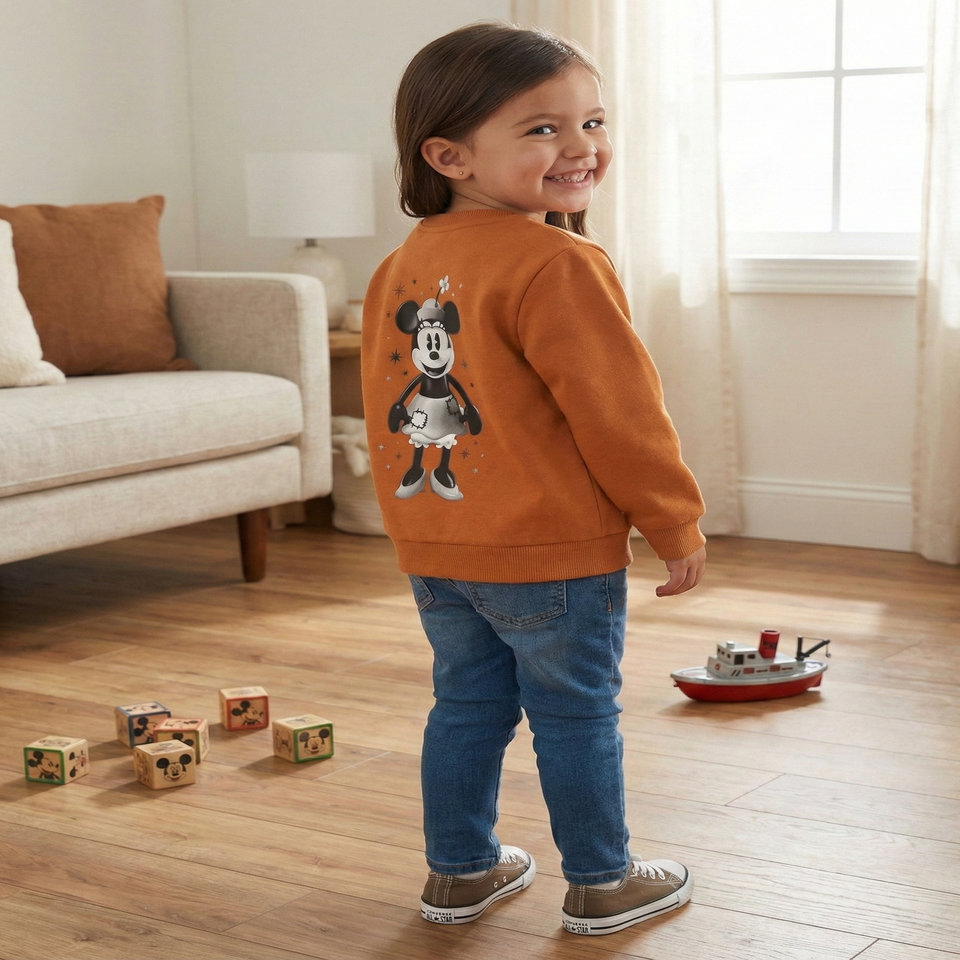 Kız Çocuk Vintage 1928 Steamboat Willie Temalı % 100 Pamuklu İçi Polarlı Sweatshirt (Turuncu)