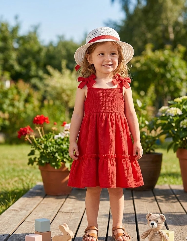 - Tam Takım Şıklığı: Omuzları fiyonk detaylı büzgülü elbise ve kombini tamamlayan uyumlu yazlık şapka bir arada.