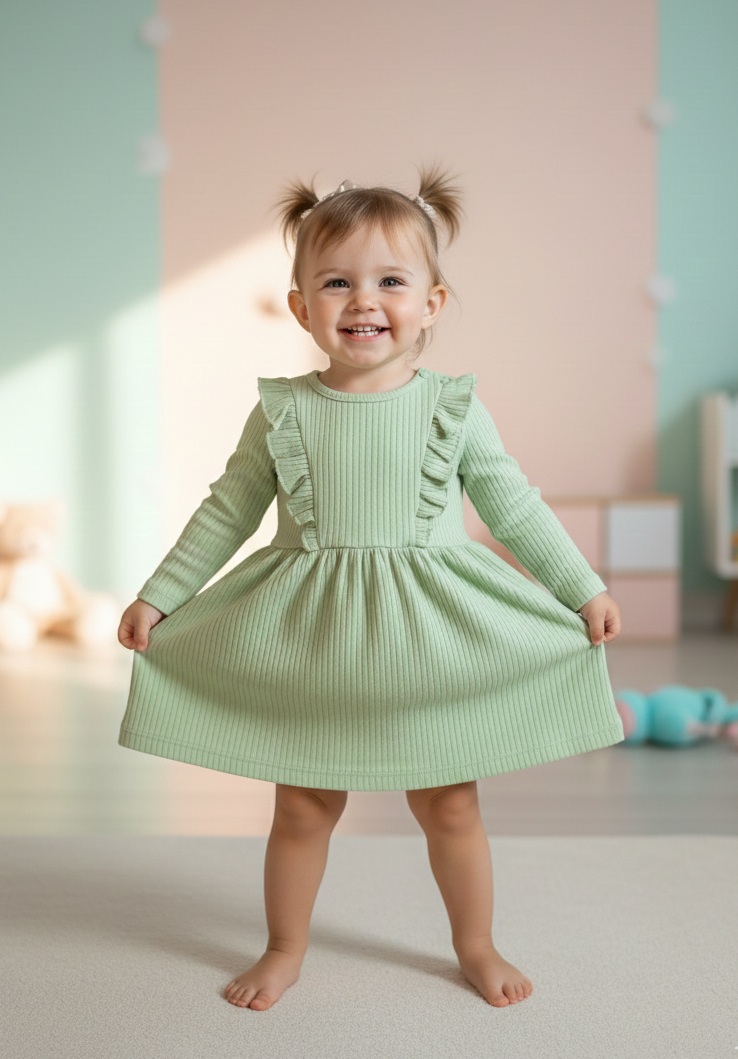 Minik prenseslerin gardırobuna ferahlık katacak Mint Yeşili Fırfırlı Elbise, hem günlük kullanım hem de özel günler için şıklığı ve konforu bir arada sunuyor. Yumuşacık fitilli kumaşı ve omuzlarındaki zarif fırfır detaylarıyla çocuklarınızın hareket özgürlüğünü kısıtlamadan stil sahibi olmalarını sağlar.