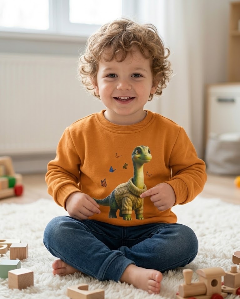 Sevimli Dinozor Baskılı % 100 Pamuklu İçi Polarlı Mevsimlik Sweatshirt (Turuncu)