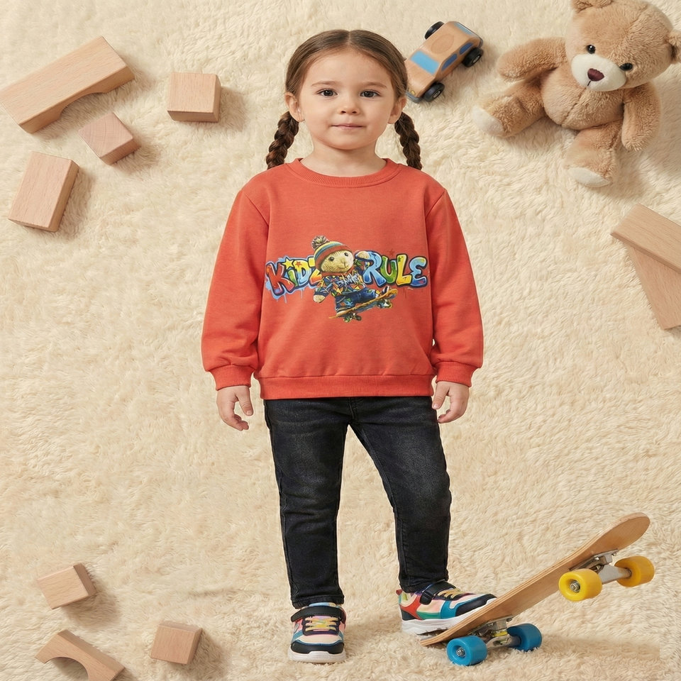 Sevimli KidzRule Kaykaylı Ayıcık Baskılı Kırmızı % 100 Pamuk İçi Polarlı Çocuk Sweatshirt (Pembe)