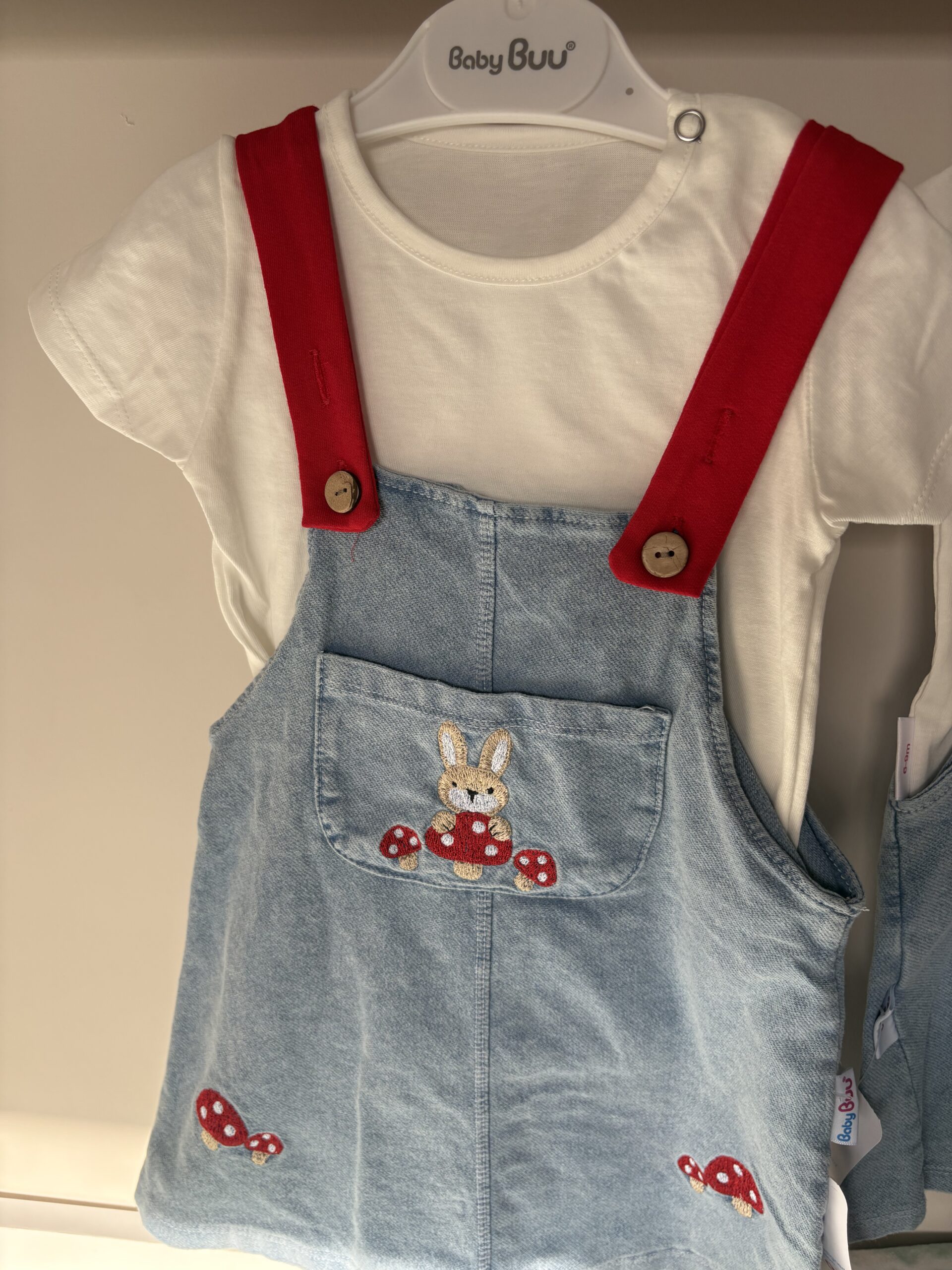 (Videolu) Sevimli Mantar ve Tavşan Nakış Detaylı Bebek Kot Salopet ve T-shirt Seti – Kırmızı Askılı