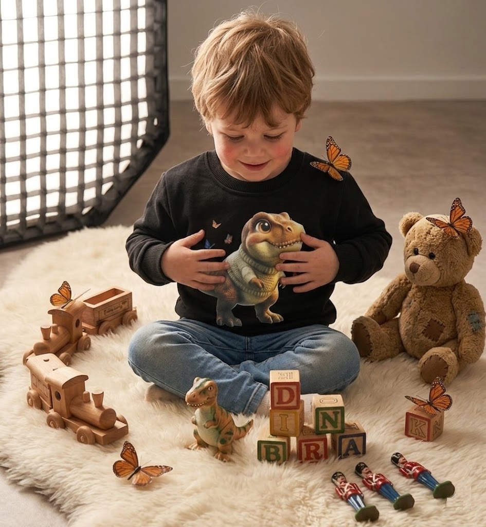 Sevimli Trex Dinozor Baskılı % 100 Pamuklu İçi Polarlı Mevsimlik Sweatshirt (Siyah)