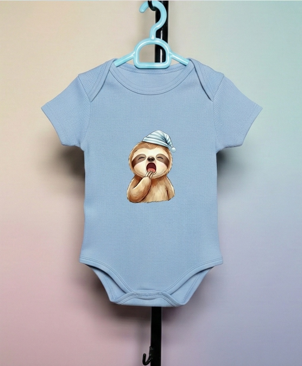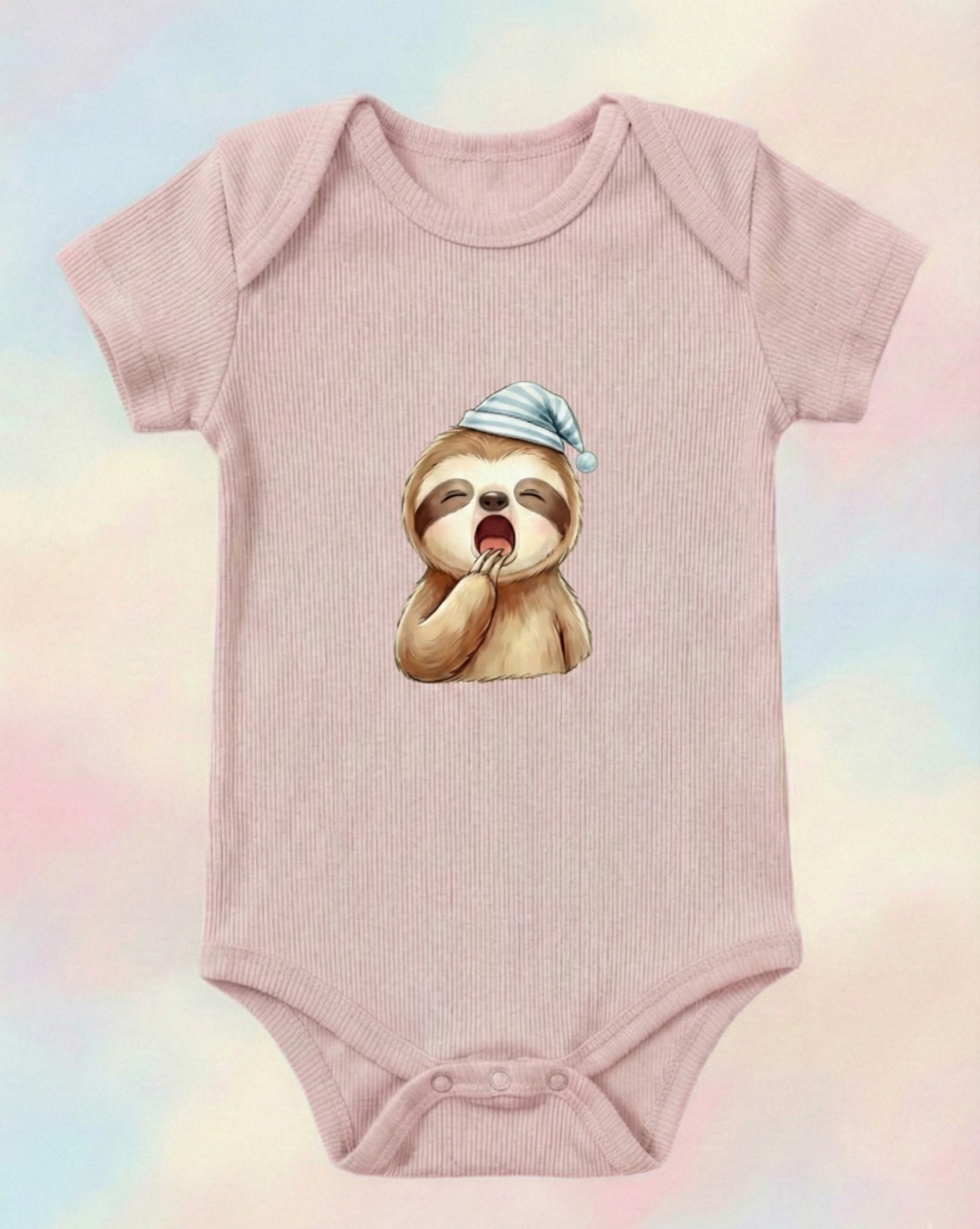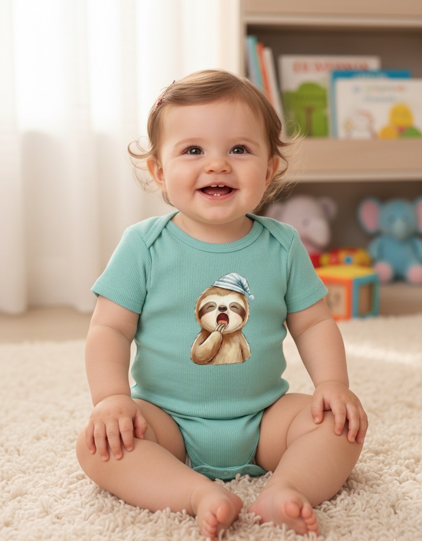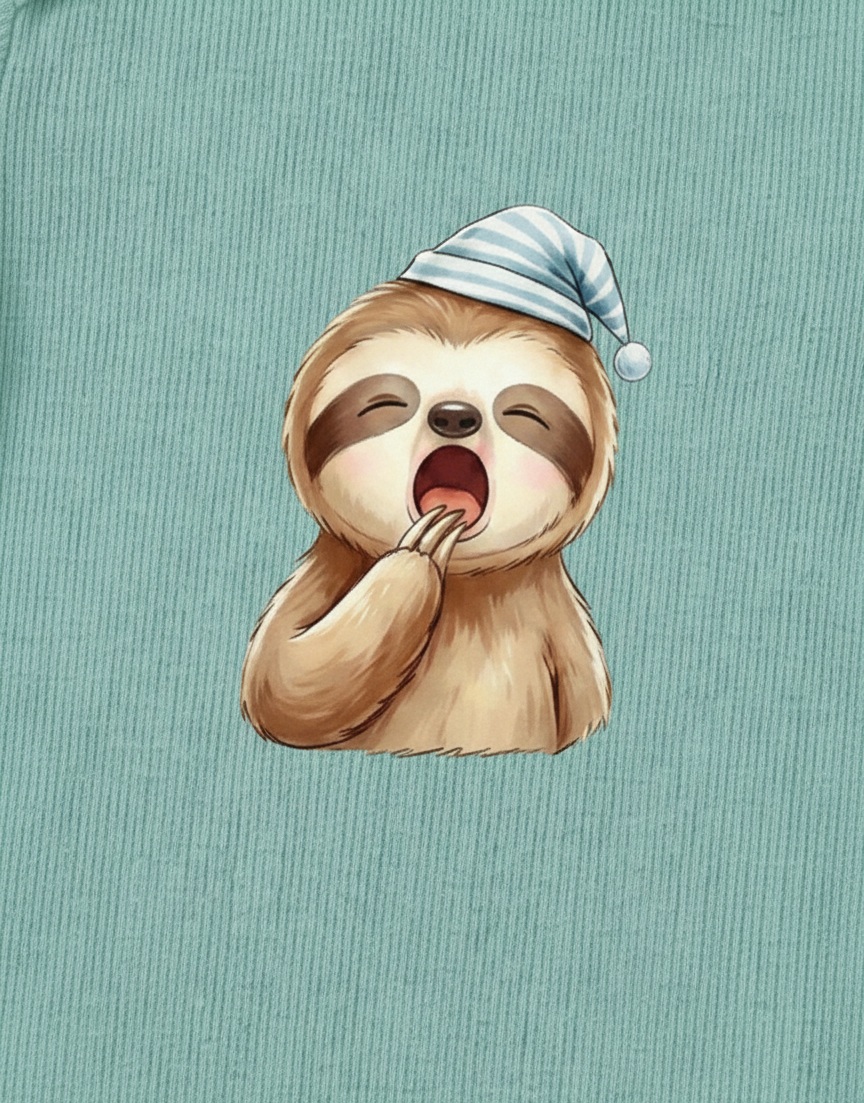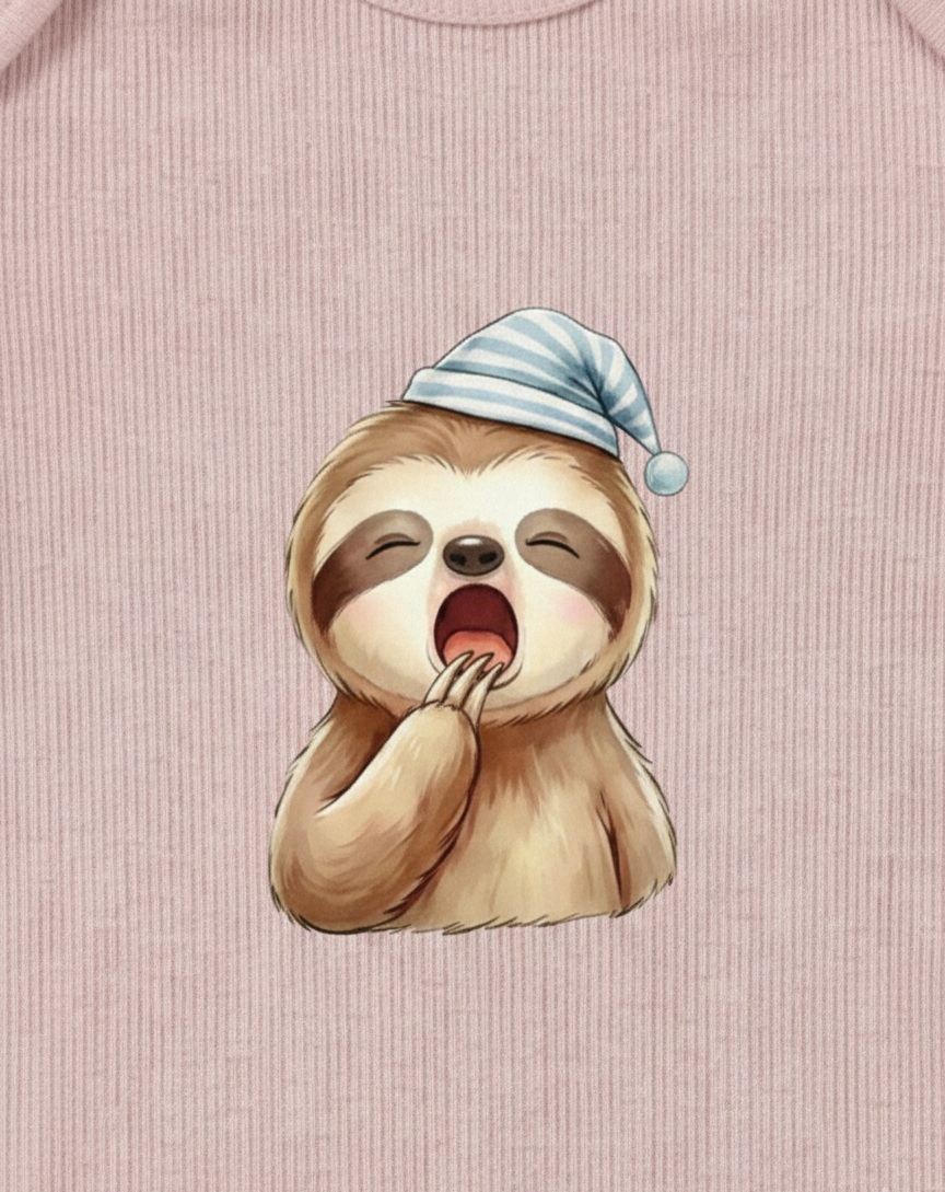 Uykucu Tembel Hayvan Desenli % 100 Pamuk Kaşkorse Bebek ve Çocuk Zarf Yaka Zıbın&Body